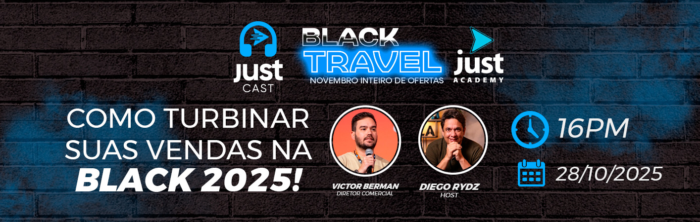 E pra você sair na frente, vem aí um episódio especial do JustCast, no dia 28/10 às 16h, com Victor Berman, nosso Diretor Comercial, e Diego Rydz, nosso Diretor de Marketing. Eles vão revelar tudo o que você precisa saber para aproveitar ao máximo a Black Travel — incluindo: